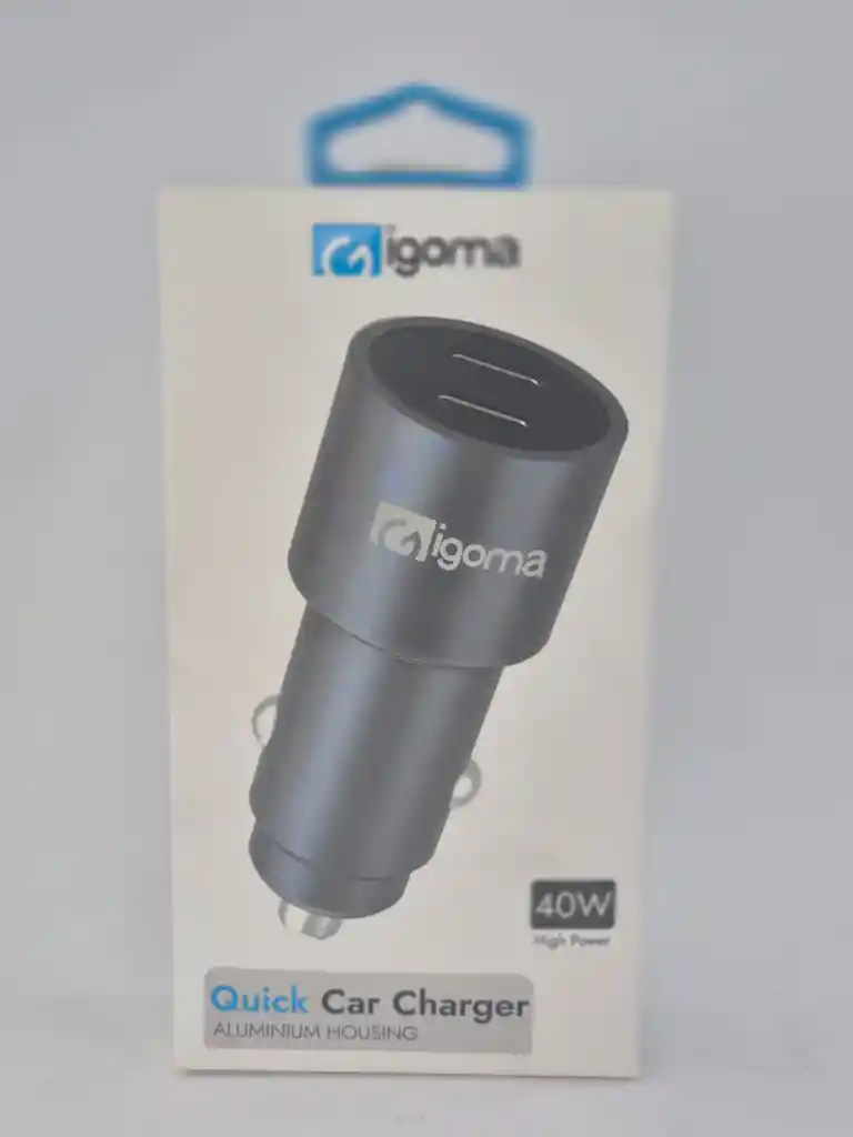 El adaptador Quick Car Charger CH-22 Igoma es un cargador de coche de metal, diseñado para ofrecer máxima eficiencia y seguridad. Con dos puertos USB-C de 40W en total, proporciona una salida potente de 20W por puerto, ideal para cargar múltiples dispositivos simultáneamente. Especificaciones Técnicas Este cargador cuenta con una entrada de DC 12-24V y ofrece salidas independientes. C1 y C2 permiten hasta 3A a 5V, 2.22A a 9V, y 1.67A a 12V. Es perfecto para mantener tu dispositivo cargado en viajes largos, garantizando una carga rápida y efectiva. Diseño y Cumplimiento de Normativas Su construcción en metal y el elegante anillo de luz azul no solo lo hacen atractivo, sino también robusto. Cumple con los estándares CE y RoHS, asegurando calidad y seguridad en su uso diario.