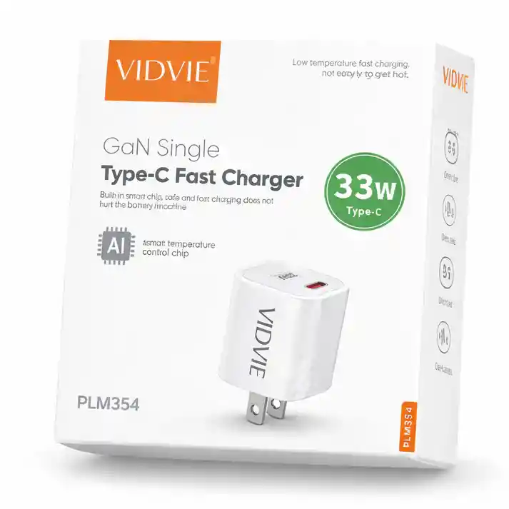 Breve descripción Potencia, seguridad y tecnología avanzada en un diseño compacto. El cargador VIDVIE PLM354 de 33W con tecnología GaN ofrece carga ultrarrápida, control inteligente de temperatura y máxima eficiencia para tus dispositivos. Características principales Potencia máxima de 33W Tecnología GaN de alta eficiencia Puerto único Type-C Compatible con carga rápida PD y PPS Salida: 5V=3A, 9V=3A, 12V=2.5A, 15V=2A, 20V=1.5A PPS 3.3V–11V=3A Chip inteligente con control de temperatura Entrada 100-240V 50/60Hz Tamaño compacto 48.5 × 32.5 × 32.5 mm Peso ligero 41.9 g Principales beneficios Carga hasta 400% más rápida que cargadores convencionales Menor generación de calor gracias a tecnología GaN Protege la batería con chip inteligente AI Ideal para celulares, tablets y otros dispositivos USB-C Diseño compacto perfecto para viajes Material del producto Fabricado en PC (policarbonato) resistente al calor y de alta durabilidad. Contenido del paquete 1 Cargador VIDVIE PLM354 33W Manual de usuario Garantía de 30 días por defecto de fábrica Este producto cuenta con garantía de 90 días por defectos de fabricación. No cubre daños por golpes, humedad, mal uso o alteraciones del producto.