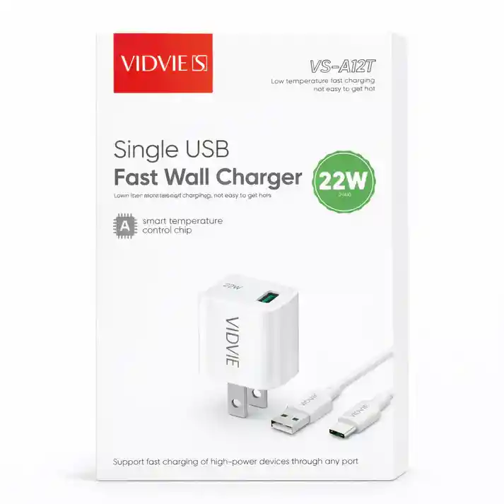 El cargador VIDVIE VS-A12T de 22W ofrece carga rápida y segura para tus dispositivos. Diseño compacto, puerto USB universal y chip inteligente de control de temperatura para proteger tu batería mientras cargas. Características principales Modelo VS-A12T Potencia máxima 22W Puerto USB estándar Salida 5V/3A Salida 9V/2.5A Salida 12V/1.87A Entrada AC 110V–220V Chip inteligente de control de temperatura Diseño compacto y portátil Principales beneficios Carga más rápida que cargadores convencionales Protección contra sobrecalentamiento Compatible con celulares, tablets y otros dispositivos USB Ideal para casa, oficina o viajes Tamaño práctico que no ocupa espacio Material del producto Fabricado en policarbonato (PC) resistente al calor y de alta durabilidad. Contenido del paquete 1 Cargador VIDVIE VS-A12T 22W 1 Cable USB a USB-C Manual de usuario Garantía de 30 días por defecto de fábrica Producto con garantía de 90 días por defectos de fabricación. No cubre daños por mal uso, golpes, humedad o alteraciones del producto.