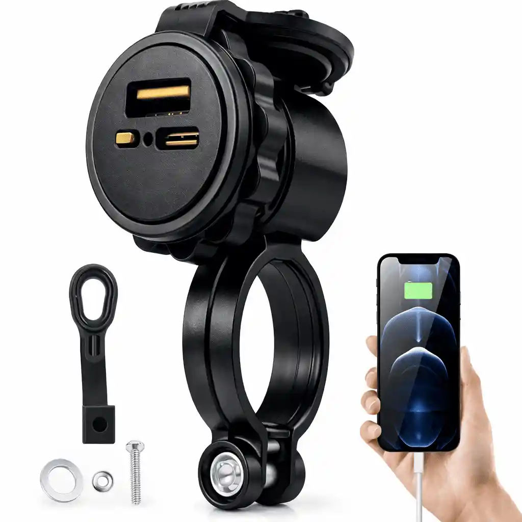 Material: Carcasa de plástico ABS de alta resistencia. Ajuste: Cuenta con abrazadera metálica ajustable para instalarse en el manubrio de la moto. Detalles: Puerto tipo C; voltaje de entrada de 12V. Incluye kit de instalación. Ideal para cargar celulares, GPS, cámaras o intercomunicadores.