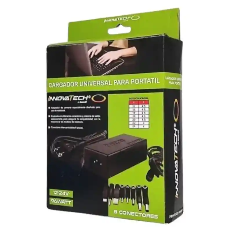 DUDAS EL WHATSAPP 3108270048 Características Técnicas • Marca: Innovatech • Tipo: Cargador universal para portátil • Voltaje de entrada: 100 – 240V AC, 50/60Hz • Voltaje de salida: 12V a 24V (ajustable según conector) • Potencia máxima: 96W • Corriente de salida: • 12V → 4.5A • 15V → 4.5A • 16V → 4.5A • 18V → 4.5A • 19V → 4.5A • 20V → 4.5A • 22V → 4A • 24V → 4A Conectores incluidos • 8 conectores intercambiables compatibles con diferentes marcas de portátiles (como HP, Dell, Lenovo, Acer, Asus, Toshiba, Samsung, etc.). • Los conectores se seleccionan según el tamaño del pin de tu portátil. Otras características • Protección contra sobretensión, sobrecorriente y cortocircuitos. • Diseñado especialmente para uso con notebooks y ultrabooks. • Adaptador automático con diferentes niveles de salida para asegurar compatibilidad. • Cable de alimentación incluido.
