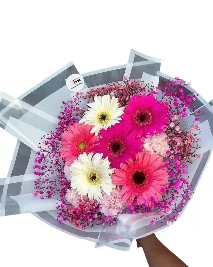 Bouquet de 6 gérberas y 6 claveles con gypsophila rosada Nota: La flor puede ser sustituida dependiendo la disponibilidad de color y del producto “Mensaje Personalizado” máximo de 30 caracteres (Dejar el mensaje en el chat, los comentarios no se previsualizan para la tienda por lo que si se dejan allí no podrá ser incluido).