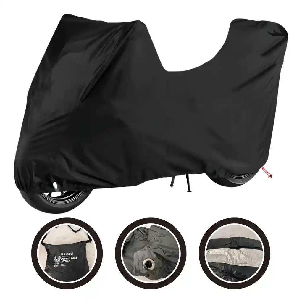 Protege contra el polvo, la lluvia ligera y el sol. Incluye un bolso para guardarla fácilmente cuando no está en uso. Cuenta con características como hebilla de seguridad para evitar robos y resorte para un ajuste firme. Material: Está fabricada con materiales semi-impermeables de alta calidad, como nailon o tela antifluido, que repelen el polvo, la suciedad y la humedad ambiental. Resiste lluvias suaves, pero no lluvia prolongada o fuerte, ya que no es 100% impermeable. Protección: Ofrece protección contra la exposición solar (incluyendo cierta protección UV), bajas temperaturas y rayones, sin deformarse. Diseño: Cuenta con un corte especial diseñado para adaptarse a motos con maletero o baúl, cubriendo uniformemente desde el baúl hasta debajo de las llantas. Seguridad: Incluye argollas metálicas antirrobo en la parte delantera para asegurar la pijama con un candado o guaya (algunas versiones incluyen la guaya con llave). Practicidad: Es ligera, fácil de instalar y de guardar, e incluye un bolso o tula de almacenamiento para un transporte cómodo.