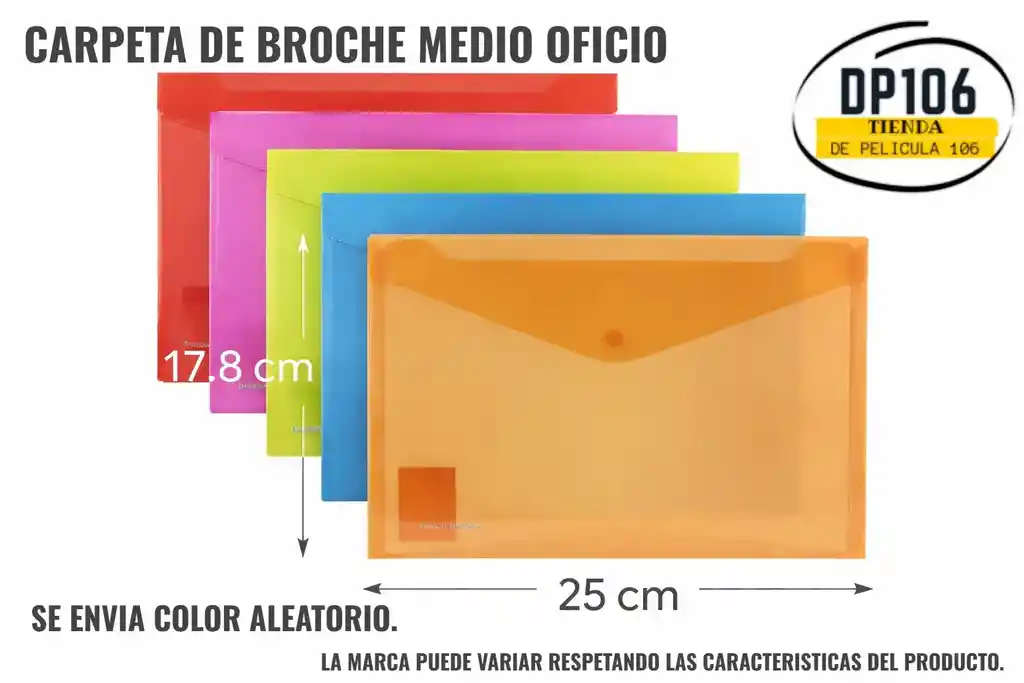 Sobre plástico resistente con broche a presión, en formato horizontal. Ideal para guardar documentos tamaño medio oficio, recibos, cartas y papelería personal. Fabricado en polipropileno duradero y fácil de limpiar. Su diseño compacto es perfecto para el colegio, oficina o uso doméstico. 📐 Tamaño: 17.8 cm x 25 cm SE ENVIA COLOR ALEATORIO. LA MARCA PUEDE VARIAR.