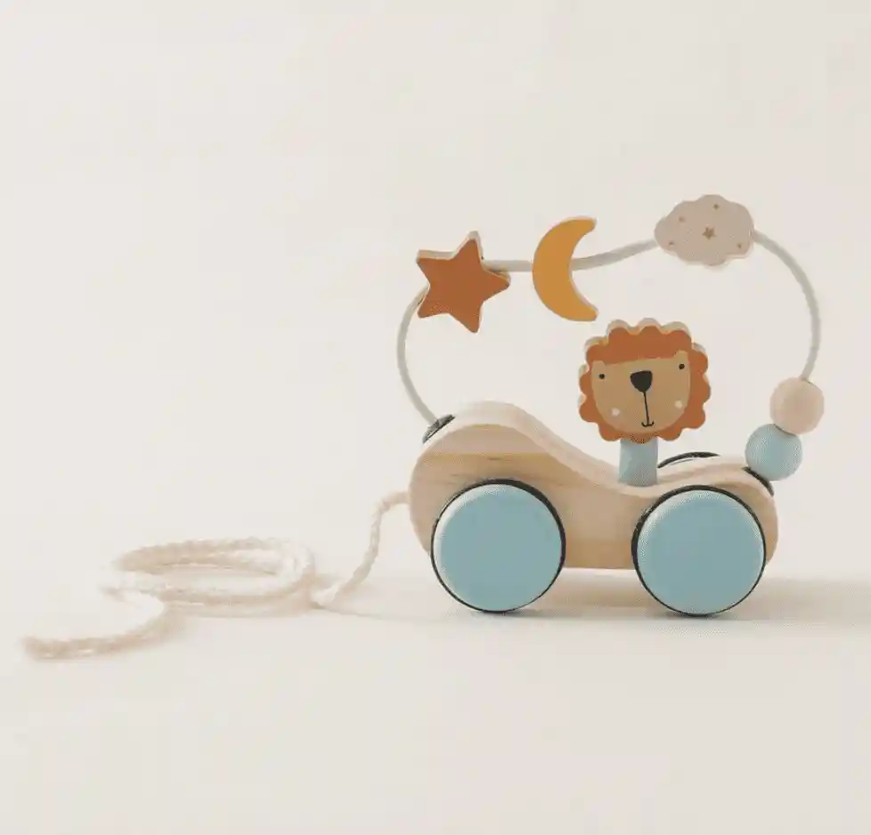 Juguete de arrastre de madera, con diseño de león y laberinto de cuentas, ideal para estimular el desarrollo temprano de los bebés. Este juguete ayuda a fortalecer la motricidad fina, la coordinación mano-ojo y la concentración, mientras el bebé empuja o arrastra el carrito y desliza las cuentas a lo largo del laberinto. Perfecto para acompañar los primeros pasos y el juego activo. Medidas aproximadas: Largo total (con cuerda): 28 cm Base del carrito: 12 cm de largo Alto: 9.7 cm