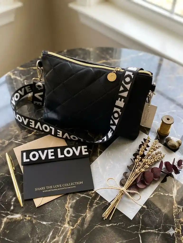 Cartera en cuerina Negra, correa "LOVE"