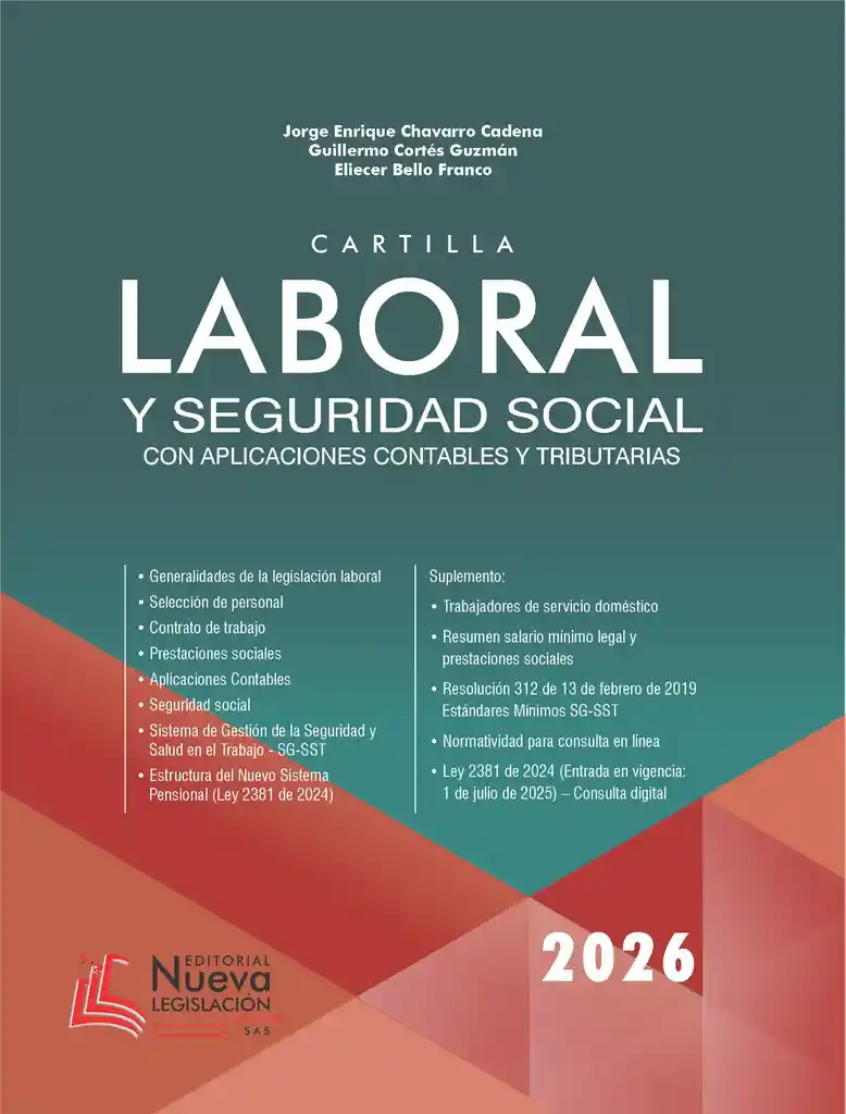 La Cartilla Laboral y de Seguridad Social 2026, actualizada con la nueva reforma laboral – Ley 2466 de 2025, comprende un análisis práctico y actualizado de la legislación laboral colombiana, desarrollado de manera clara y estructurada en siete capítulos: 1. Generalidades de la legislación laboral 2. Selección de personal 3. Contrato de trabajo 4. Prestaciones sociales 5. Aplicaciones contables y tributarias 6. Seguridad social 7. Sistema de Gestión de la Seguridad y Salud en el Trabajo (SG-SST) Esta cartilla está diseñada para que empleadores y trabajadores puedan interpretar de forma fácil, clara y simplificada los derechos, deberes y obligaciones establecidos en la legislación laboral colombiana, facilitando su correcta aplicación en el entorno empresarial y laboral, conforme a los cambios introducidos por la Ley 2466 de 2025."