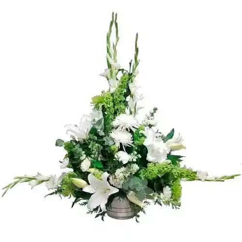 Cascada con lirios,pompones blancos,follaje verde, cartuchos La flor puede ser sustituida dependiendo la disponibilidad de color y del producto “Mensaje Personalizado” máximo de 30 caracteres (Dejar el mensaje en el chat, los comentarios no se previsualizan para la tienda por lo que si se dejan allí no podrá ser incluido)