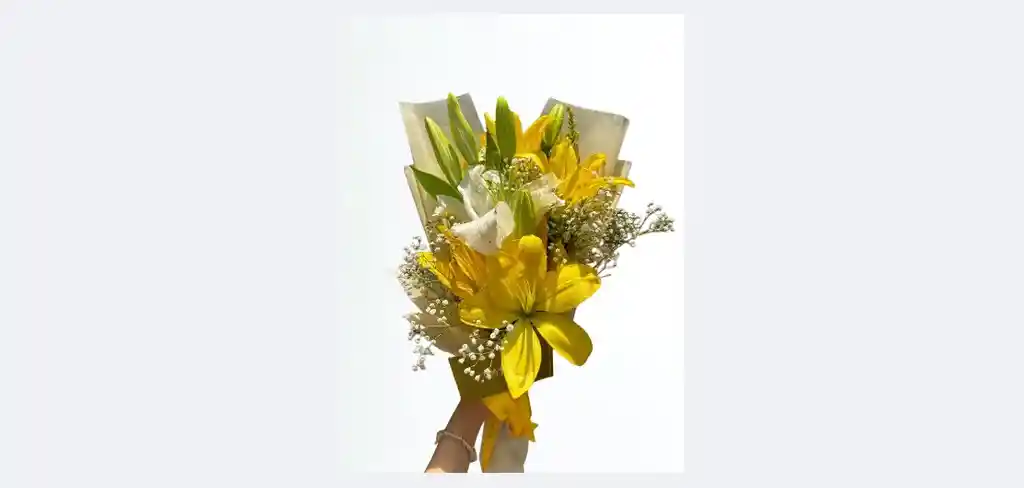 Bouquet de 4 varas de lirios amarillos Nota: La flor puede ser sustituida dependiendo la disponibilidad de color y del producto “Mensaje Personalizado” máximo de 30 caracteres (Dejar el mensaje en el chat, los comentarios no se previsualizan para la tienda por lo que si se dejan allí no podrá ser incluido).