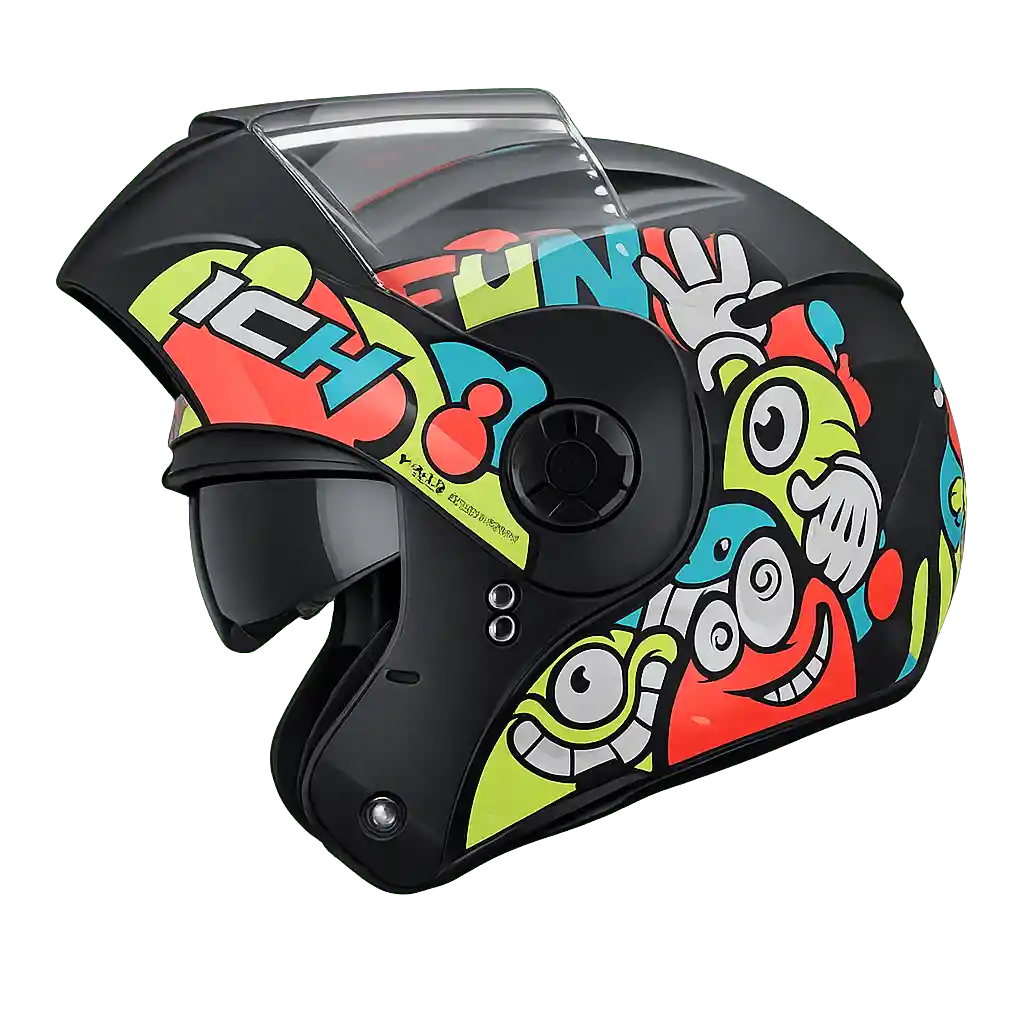 Material: Fabricado con calota externa en plástico ABS de alta resistencia, el interior cuenta con espuma de absorción de impactos y acolchado interno suave. Detalles: Sistema abatible que permite levantar la mentonera, ventilación superior y diseño gráfico moderno. Se verifica disponibilidad de diseños o estampados.