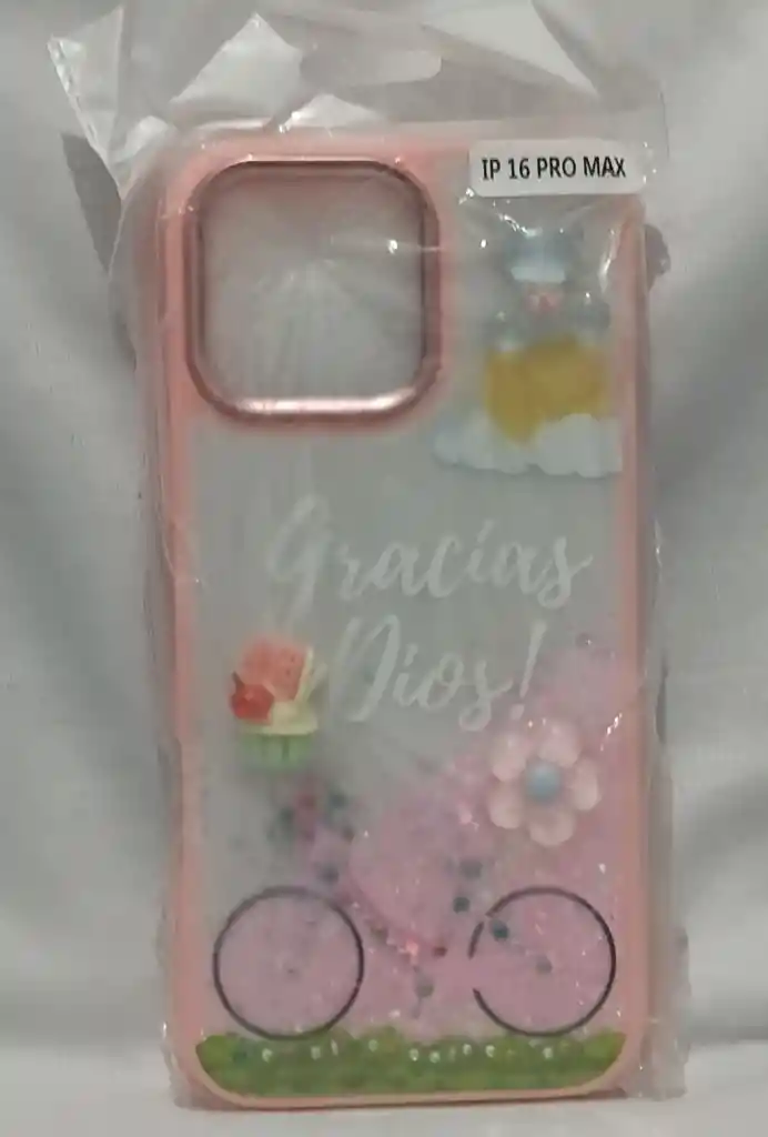 ​Mensaje Positivo: Presenta la frase "Gracias Dios!" en tipografía cursiva elegante sobre un fondo traslúcido. ​Decoración Detallada: Adornada con figuras en relieve que incluyen una flor, un cupcake y una bicicleta en la base. ​Acabado Premium: Marco de cámara reforzado con un borde metálico en tono oro rosa para mayor protección y estilo. ​Compatibilidad: Específica para iPhone 16 Pro Max.