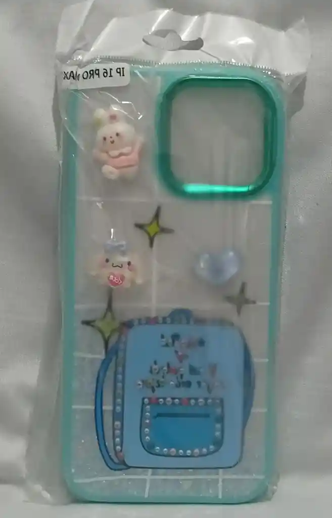 Diseño Divertido: Temática escolar que incluye una ilustración de mochila azul y fondo cuadriculado con estrellas. Accesorios 3D: Decorada con dijes en relieve de un tierno conejo y un personaje tipo "Cinnamoroll", además de un corazón translúcido. Protección Reforzada: Bisel de cámara resaltado en color verde metálico para mayor seguridad contra impactos. Compatibilidad: Ajuste perfecto para iPhone 16 Pro Max. Estilo: Estética juvenil y colorida con bordes en tono turquesa vibrante.