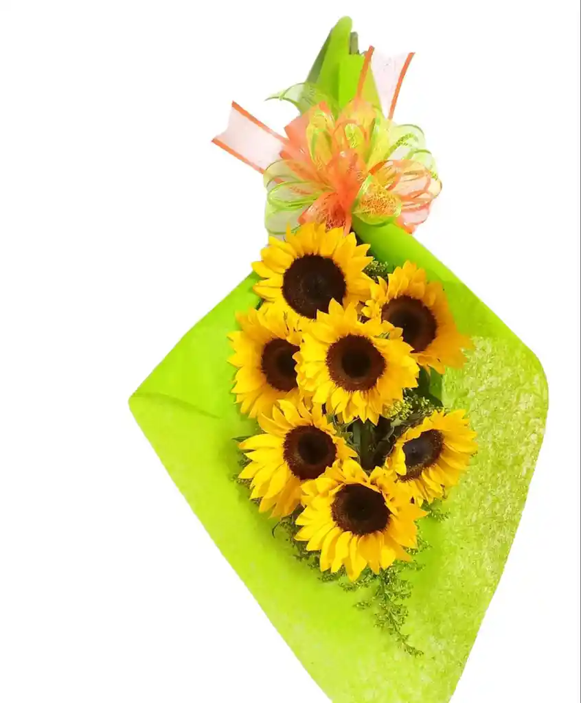 Celofán Elaborado Con 7 Unidades De Girasoles Tul Verde, Y Moño en cinta de Colores