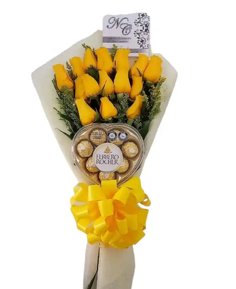Buques con 16 rosas amarillas , chocolate Rocher corazón de 8 unidades, tul beis, y moño en cinta decorativo