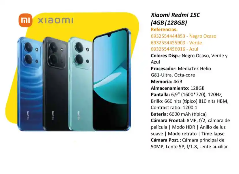 Colores Disp.: Negro Ocaso, Verde y Azul Procesador: MediaTek Helio G81-Ultra, Octa-core Memoria: 4GB Almacenamiento: 128GB Pantalla: 6,9” (1600*720), 120Hz, Brillo: 660 nits (típico) 810 nits HBM, Contrast ratio: 1200:1 Batería: 6000 mAh (típica) Cámara Frontal: 8MP, f/2, cámara de película | Modo HDR | Anillo de luz suave | Modo retrato | Time-lapse Cámara Post.: Cámara principal de 50MP, Lente 5P, f/1.8, Lente auxiliar EXPOTECNOLOGIA 3505945136