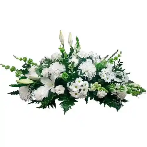 Centro de mesa con margarita blanca, pompones blancos , lirios , follaje verde y clavel . La flor puede ser sustituida dependiendo la disponibilidad de color y del producto “Mensaje Personalizado” máximo de 30 caracteres (Dejar el mensaje en el chat, los comentarios no se previsualizan para la tienda por lo que si se dejan allí no podrá ser incluido)