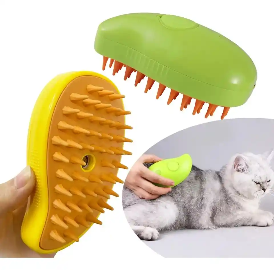 Este es un Cepillo de vapor 3 en 1 para mascotas, diseñado para perros y gatos. Funcionalidades: Sirve para cepillar, masajear y desenredar el pelaje mediante tecnología de vapor. Tecnología: Utiliza vapor suave para hidratar el pelo, reducir nudos y eliminar suciedad. Material: Está fabricado con materiales duraderos como ABS y cuenta con cerdas suaves de goma que no irritan la piel. Características: Es recargable mediante un cable USB incluido y ayuda a eliminar el pelo muerto.