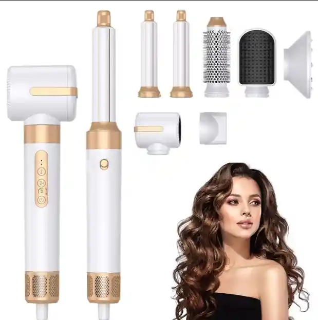 Set Moldeador Multifuncional 7 en 1: Sistema que permite secar, alisar y rizar el cabello. Incluye cabezales intercambiables como difusor, cepillo redondo, cepillo plano y barriles rizadores que utilizan el flujo de aire para moldear sin calor extremo.