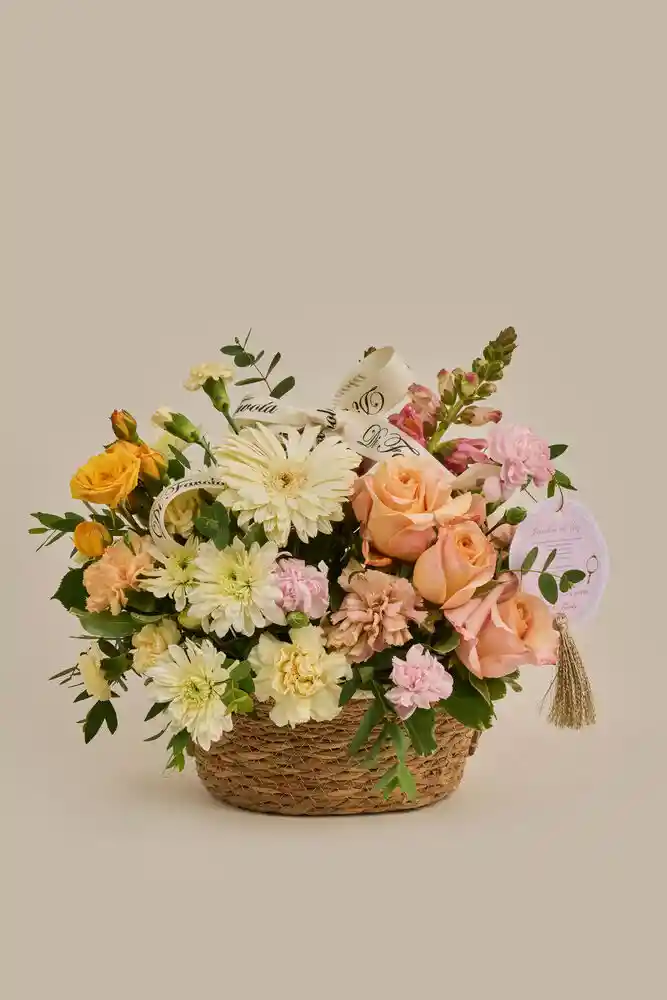 Cesta Resplandor Cálido · Tamaño S Cesta Resplandor Cálido es una composición floral luminosa y cercana, diseñada para celebrar la alegría, la dulzura y la energía que habita en la mujer. Integra rosas salmón y amarillas, crisantemos y gerberas en tonos blancos, claveles beige y rosados, acompañados de follajes naturales que aportan frescura y equilibrio. La paleta cálida: amarillo, salmón, blanco y nude simboliza admiración, gratitud, armonía y luz. Cada flor aporta suavidad y vitalidad, creando un diseño feliz, auténtico y lleno de vida. Incluye cesta tejida reutilizable, ideal para decorar espacios, organizar accesorios, o pequeños objetos en casa. Un detalle íntimo que honra con calidez y elegancia.. Incluye: - Arreglo floral - Instrucciones de cuidado - Tarjeta dedicatoria - Tarjeta especial edición Día de la Mujer Jardín de Luz y borla decorativa