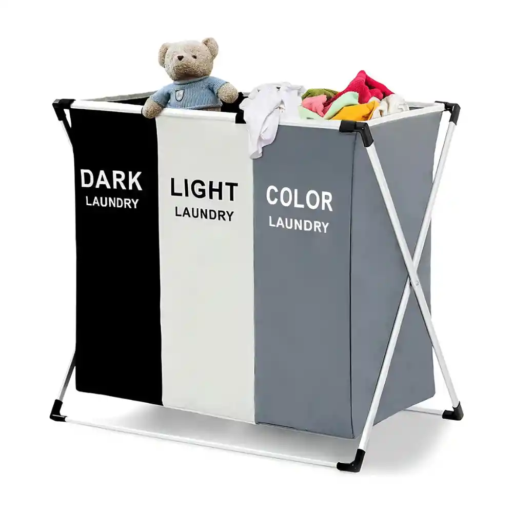 FUNCIÓN DE ALMACENAMIENTO CLASIFICADA: Dividida en 3 compartimentos para que pueda clasificar su color oscuro y claro a medida que deja caer la ropa en el cesto. Cada bolsa de ropa puede contener hasta 2 cargas de ropa de tamaño estándar. Transporte más estable y fácil: 6 correas en la parte superior son buenas para la estabilidad. Las correas de velcro son fáciles de poner y quitar y hacen que la bolsa de lavandería sea fácil de transportar. Bolsas Ahorradoras de Espacio: la parte superior con cordón de malla con cierre de cierre le ayuda a apilar la ropa y transportarla sin dejar caer. Duradero y liviano: diseñado a partir de un marco de aluminio desmontable y ensamblado y una bolsa de material duradero para ser liviano pero duradero para uso frecuente en su dormitorio, lavandería, baño, universidad, apartamento o en el armario, etc. El marco de aluminio (X) Diseño se pliega fácilmente para guardarlo cuando no utilizar. Proporcione resistencia duradera: su robusto exterior de tela Oxford 600D se mantiene bien con el tiempo incluso con el uso diario. Cesta para la Colada plegable con 3 secciones. Con un diseño moderno y elegante, combina las formas estéticas y prácticas. Está hecho de material de alta calidad, resistente y duradero. Funcionará perfectamente para ti. Cuenta con un diseño compacto y hermoso. Diseño de tres celosías que proporciona más espacio para almacenar ropa sucia. Se utiliza principalmente para guardar ropa sucia, juguetes y artículos diversos. Especificaciones: Dimensiones (total):64 cm (L) x 38 cm (W) x 68cm (H); Color: multicolor; Material: aluminio, algodón, lino; Utilizado para: clasificación de lavandería; Características: plegable, plegable, resistente, de gran capacidad con 3 compartimentos