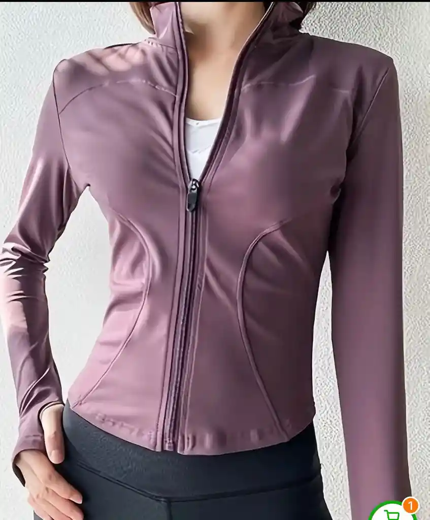 Chaqueta licrada deportiva dama, color morado, talla L y material licrado liso.