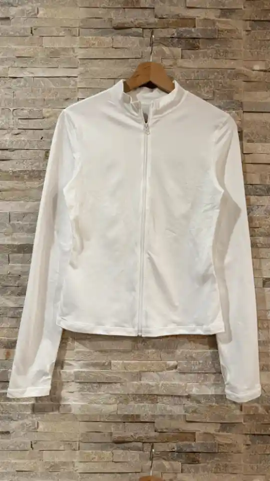 Chaqueta Deportiva Lulu Blanca Talla M Estilo y comodidad en una sola prenda. 💫 Cierre suave (smooth zipper) para un acabado elegante y funcional. Cuello alto (stand collar design) que aporta un toque sofisticado y protege del frío. Inspirada en el estilo athleisure, perfecta para usar dentro y fuera del gimnasio. Ideal para combinar con tu outfit deportivo o casual. 🖤