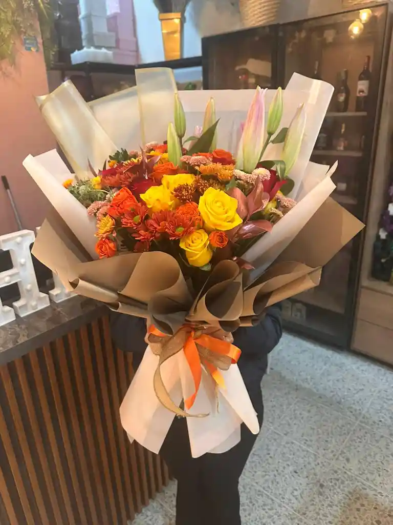 Bouquet de gran formato con una composición intensa en tonos amarillos, naranjas y rojizos, complementados con acentos verdes que aportan profundidad y equilibrio. Su diseño estructurado combina volumen y contraste, logrando una presentación llamativa y sofisticada. Está envuelto en papel premium en tonos neutros y tierra, dispuesto en capas que realzan su forma y presencia, y finalizado con un lazo decorativo que aporta un detalle elegante y distintivo. Los bouquets pueden tener leves variaciones de flor, pero siempre manteniendo una armonía de tonos.
