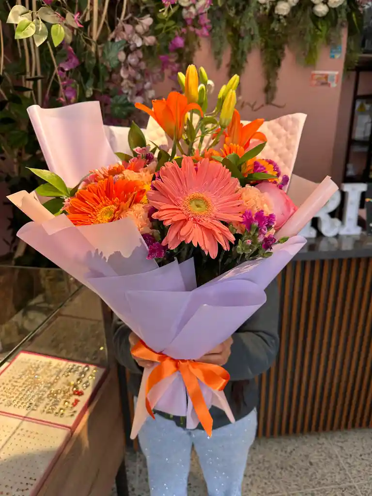 Bouquet de formato mediano con una composición fresca y vibrante en tonos coral, naranja y rosado, complementados con acentos verdes que aportan equilibrio y contraste. Su diseño combina distintas alturas y texturas, logrando un arreglo dinámico, armonioso y moderno. Está envuelto en papel premium en tono lila suave, cuidadosamente estructurado para realzar su forma, y finalizado con un lazo satinado en color naranja que aporta un detalle elegante y distintivo. Los bouquets pueden tener leves variaciones de flor, pero siempre manteniendo una armonía de tonos.