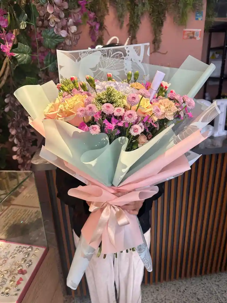 Bouquet de gran formato con una composición suave y armoniosa en tonos durazno, rosado y lila, complementados con acentos verdes que aportan frescura y equilibrio. Su diseño voluminoso integra distintas texturas y alturas, logrando una presentación elegante y delicadamente sofisticada. Está envuelto en papel premium en tonos pastel con detalles translúcidos, dispuesto en capas estructuradas que realzan su forma, y finalizado con un lazo satinado que aporta un acabado fino y distinguido. Los bouquets pueden tener leves variaciones de flor, pero siempre manteniendo una armonía de tonos.