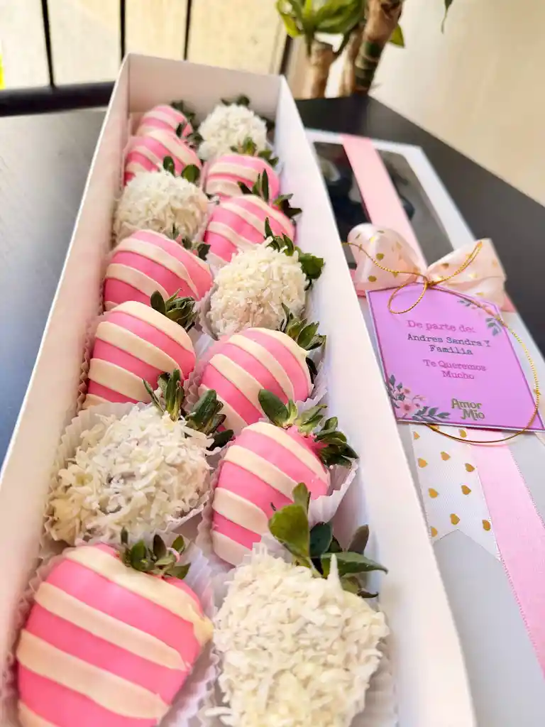 Una combinación irresistible de frescura y chocolate. Nuestra caja de 14 fresas premium cubiertas con chocolate es el equilibrio perfecto entre dulzura, elegancia y sabor artesanal. Incluye tarjeta