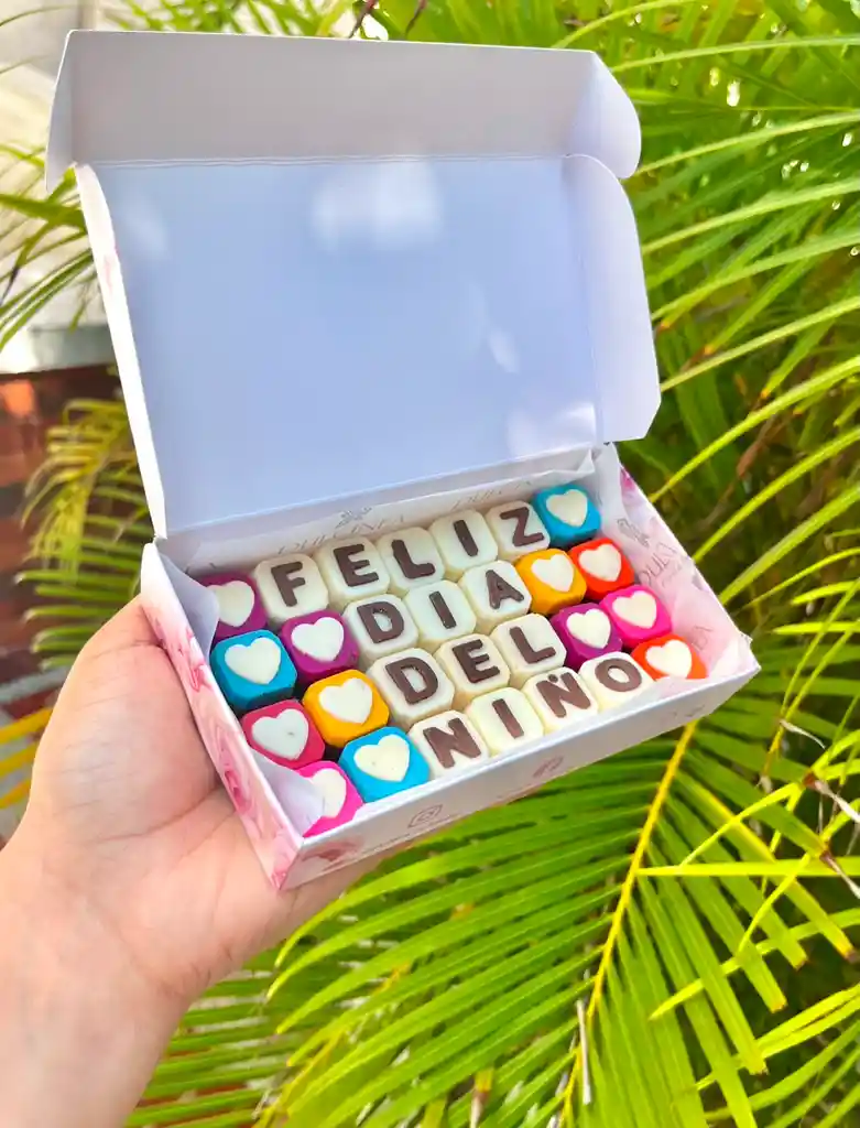 28 cubos de chocolate feliz dia de niñp caja decorada con rosa natural