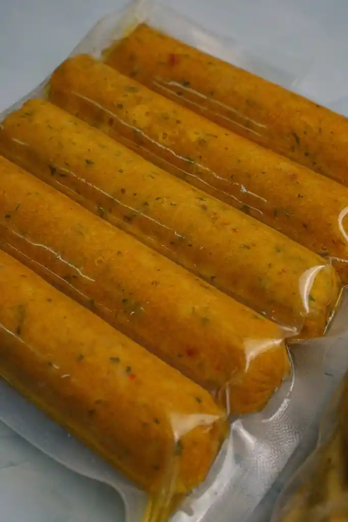 Chorizos hechos con carne de pescado, precocidos, con un peso neto de 400 g, por 5 unidades empacados al vacío.