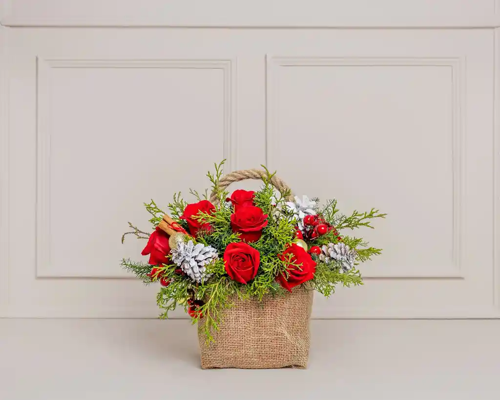 Es un arreglo navideño elaborado con rosas rojas, pino fresco y piñas nevadas en una encantadora cesta tejida. Un diseño natural, cálido y elagante, ideal para decorar espacios o regalar en Navidad. Incluye tarjeta de cuidados y mensaje personalizado.