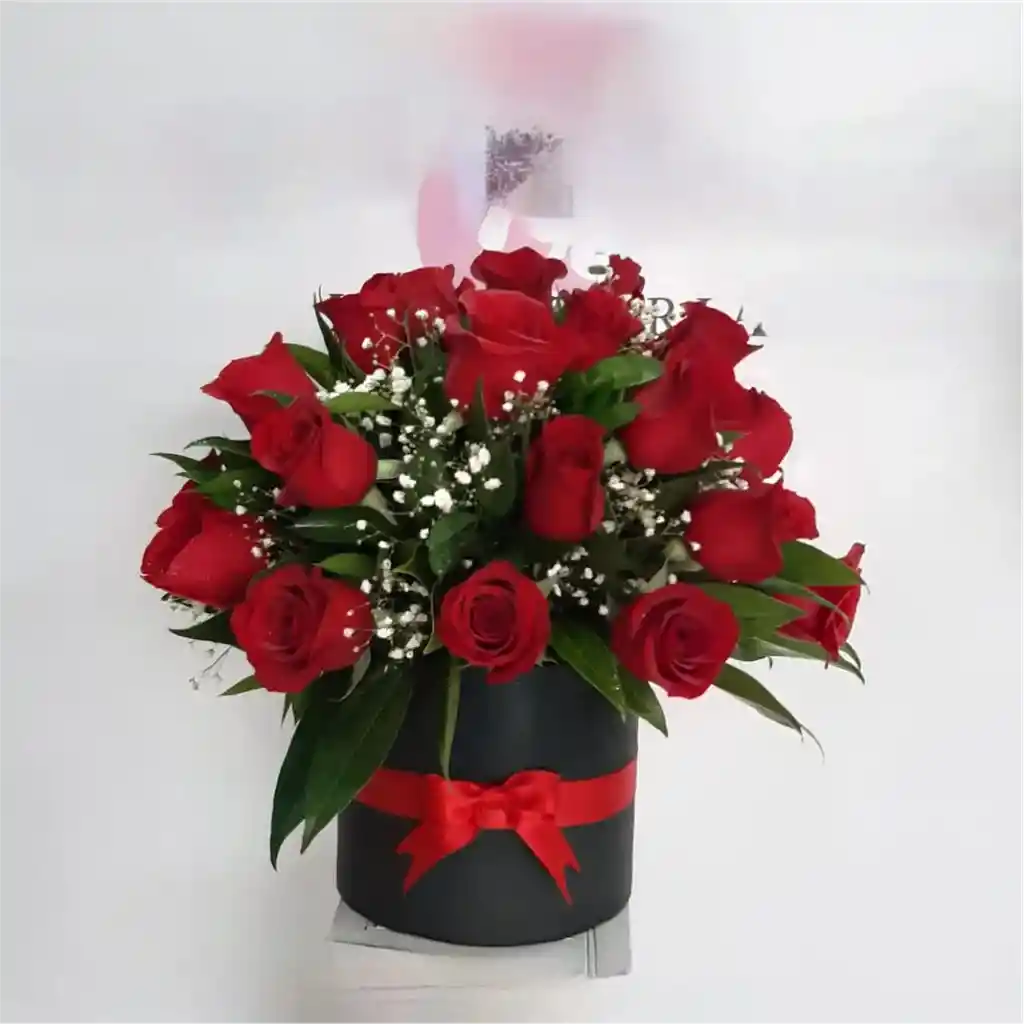 Caja cilíndrica con 24 rosas rojas frescas, decorada con lazo rojo. Un regalo romántico y sofisticado para Amor y Amistad, aniversarios o cumpleaños,. Color de la flor sujeto a disponibilidad.