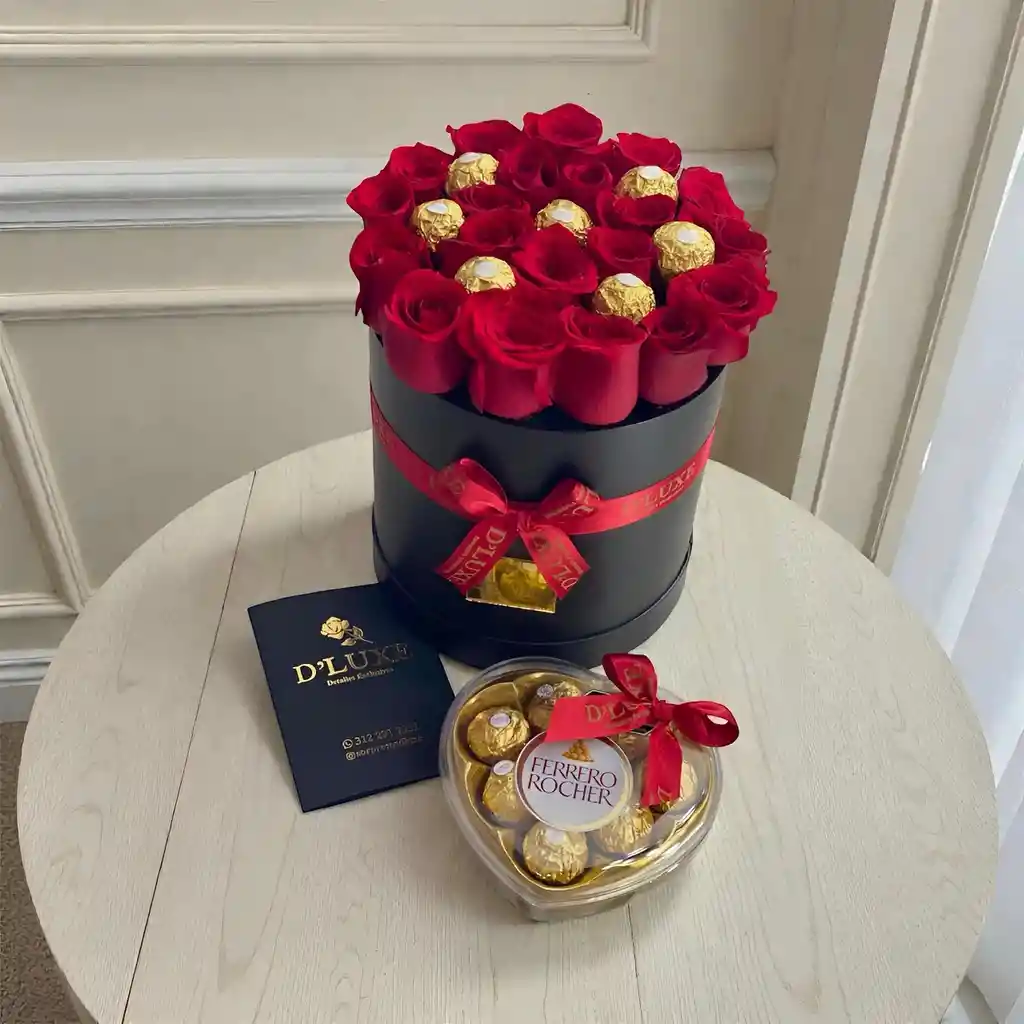 Hermoso cilindro elaborado con rosas rojas y Ferreros rocher. Incluye Ferreros en forma de corazón