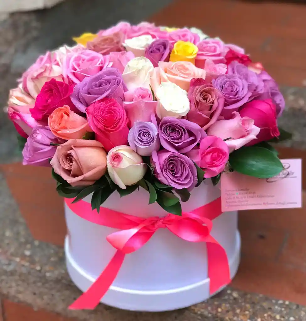 -35 unidades de rosas de colores -cinta de color de su preferencia -Decoración -Tarjeta -cilindro de caja de cartón duro