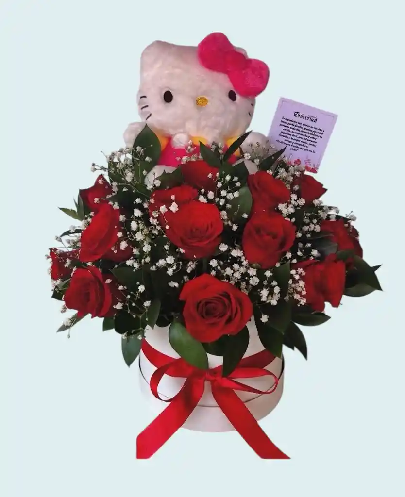 contiene 20 rosas rojas follaje verde follaje blanco peluche hello kitty decoración tarjeta personalizada