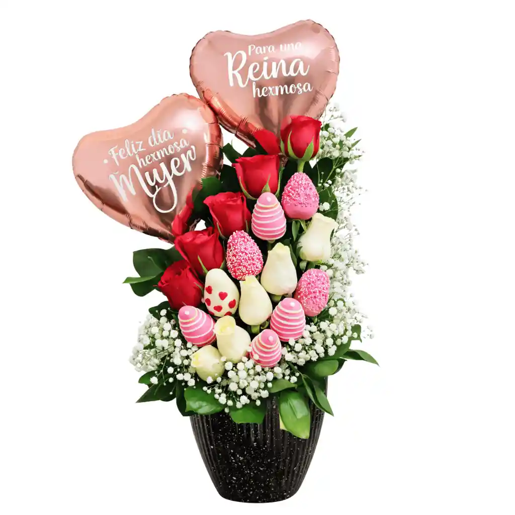 Cilindro Rosas Y Fresas Un regalo completo que combina flores, dulzura y un toque festivo en cada detalle 🎉🌹. Incluye un arreglo en base de melamina con diez rosas frescas y follaje, ocho fresas cubiertas con chocolate y dos globos de 9" para la ocasión. Puedes elegir el color de las rosas para hacerlo aún más especial. Si nos envías tu mensaje, te obsequiamos la tarjeta personalizada para expresar tus sentimientos de manera única ✨. REF: BOX04