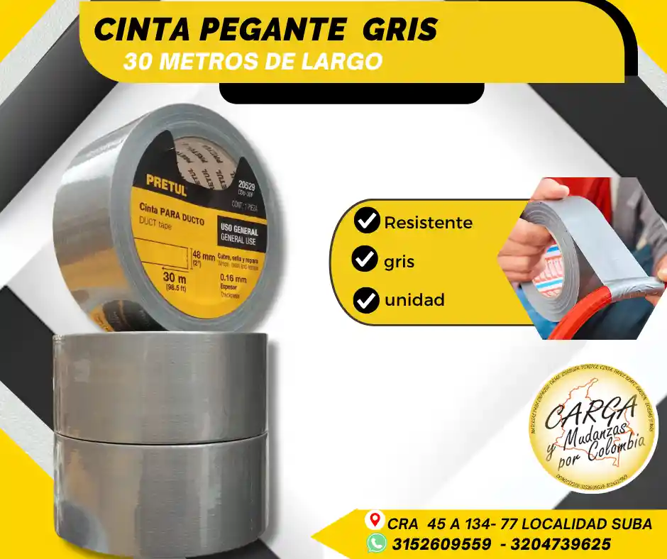 La cinta gris, conocida comúnmente como duct tape o cinta de montaje, es una herramienta adhesiva multipropósito de alta resistencia, fabricada con tela de algodón/poliéster laminada con polietileno y adhesivo de caucho. Es impermeable, se corta fácilmente a mano y se usa para sellar ductos, reparaciones rápidas, embalaje y fijación en interiores y exteriores.