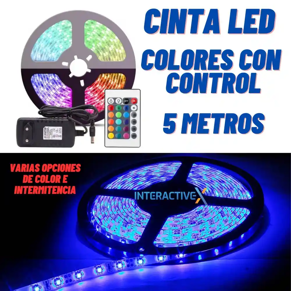 Descripción Cinta De Luz Led Multicolor Rgb 5 Metros Tira Led + Control Cinta led RGB 5050 en silicona Con control y adaptador RGB multicolor Rollo por 5 metros ( se recomienda utilizar silicona líquida para una mejor fijación) Potencia: 40w Este producto contiene: Rollo cinta led 5050 x 5 metros Control de cambio de Color
