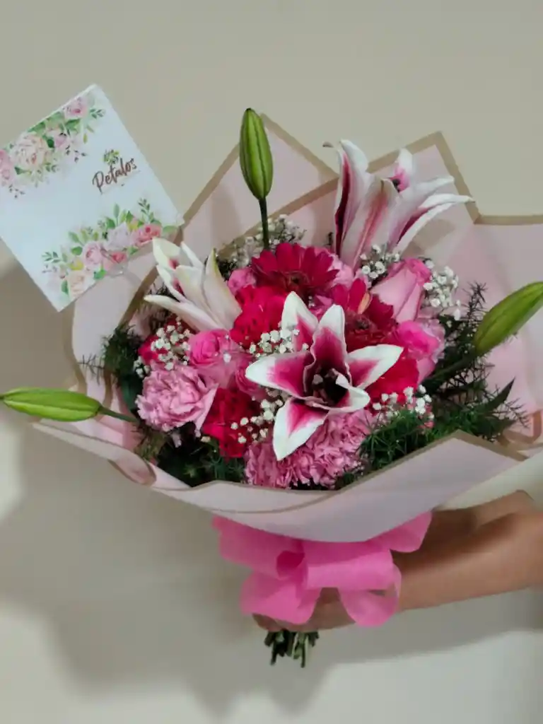 Hermoso Bouquet elaborado con rosas, claveles y lirios en tonos rosados y fucsias, acompañado de Gypsophila y fino follaje verde. Envuelto en papel de exportación y moño elegante. Tarjeta personalizada (dejar el mensaje en los comentarios o chat)