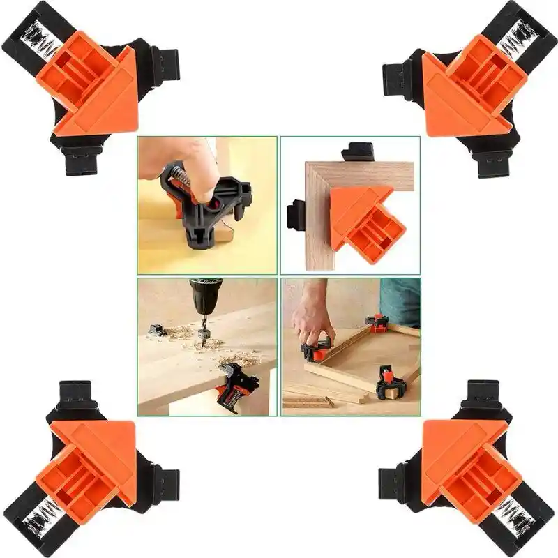 Un conjunto de 4 abrazaderas de ángulo: 4 ángulos para uso simultáneo, reduciendo la carga de trabajo y mejorando la eficiencia, para ángulos de 45 y 90 grados Pinza de ángulo multifunción para esquinas, adecuada para carpintería, reparación de armarios y muebles, refuerzo de marco de fotos, proyectos de bricolaje, etc Operación con una sola mano, la segunda operación es libre para la pieza de trabajo, simple y conveniente. Al apretar o pegar la tabla en un ángulo de 90°, la ayuda de fijación se utiliza para la conexión de esquina y T, en una sola operación, el agujero se perfora y aprieta en dos pasos. Los materiales resistentes y duraderos hacen que los alicates tengan una larga vida útil.