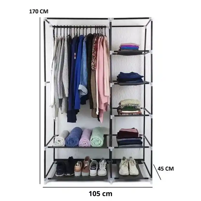 Es un diseño "tres en uno" que ahorra espacio. Cuenta con gran capacidad de almacenamiento. Dimensiones del producto: 10545170cm. Ideal para mantener la ropa, zapatos y accesorios organizados. Multifuncional: Diseñado para usarse como perchero y organizador de ropa y zapatos.  Ahorro de espacio: Su diseño "tres en uno" optimiza el almacenamiento vertical en cualquier habitación, ideal para dormitorios o vestidores.  Gran capacidad de almacenamiento: Cuenta con múltiples estantes de rejilla y barras para colgar ropa, maximizando el espacio disponible.  Construcción robusta: Fabricado con una estructura de metal resistente y duradero.  Diseño abierto y accesible: Permite una fácil visualización y acceso a todas las prendas y accesorios.  .CM8kHf text{fill:var(--m3c11)}.CM8kHf{font-size:1.15em}.j86kh{display:inline-block;max-width:100%} Especificaciones del producto: Marca: Teclop Material: Estructura de metal/acero.  Dimensiones: \(105\times 45\times 170\) cm (ancho x profundidad x alto).  Color: Negro (como se muestra en la imagen y resultados de búsqueda).
