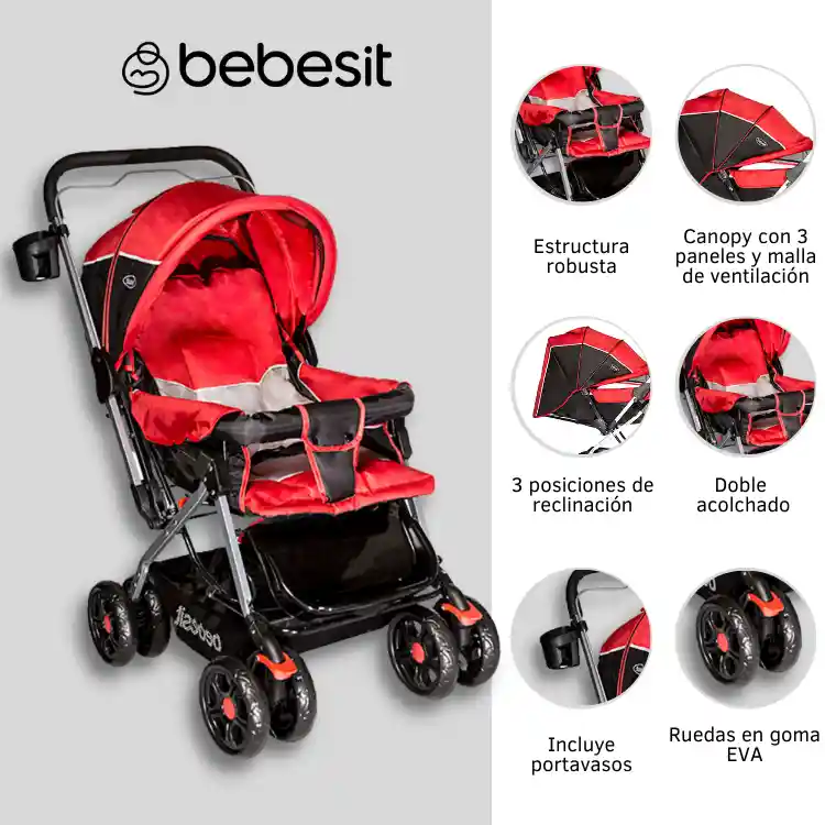 • Asiento tipo cuna con cobertor • Asiento reversible • Estructura dorada robusta • Mango ergonomico • Plegado compacto • Espaldar reclinable • Reposapiés ajustable • Canopy extensible • Amplia canasta portaobjetos • Freno centralizado