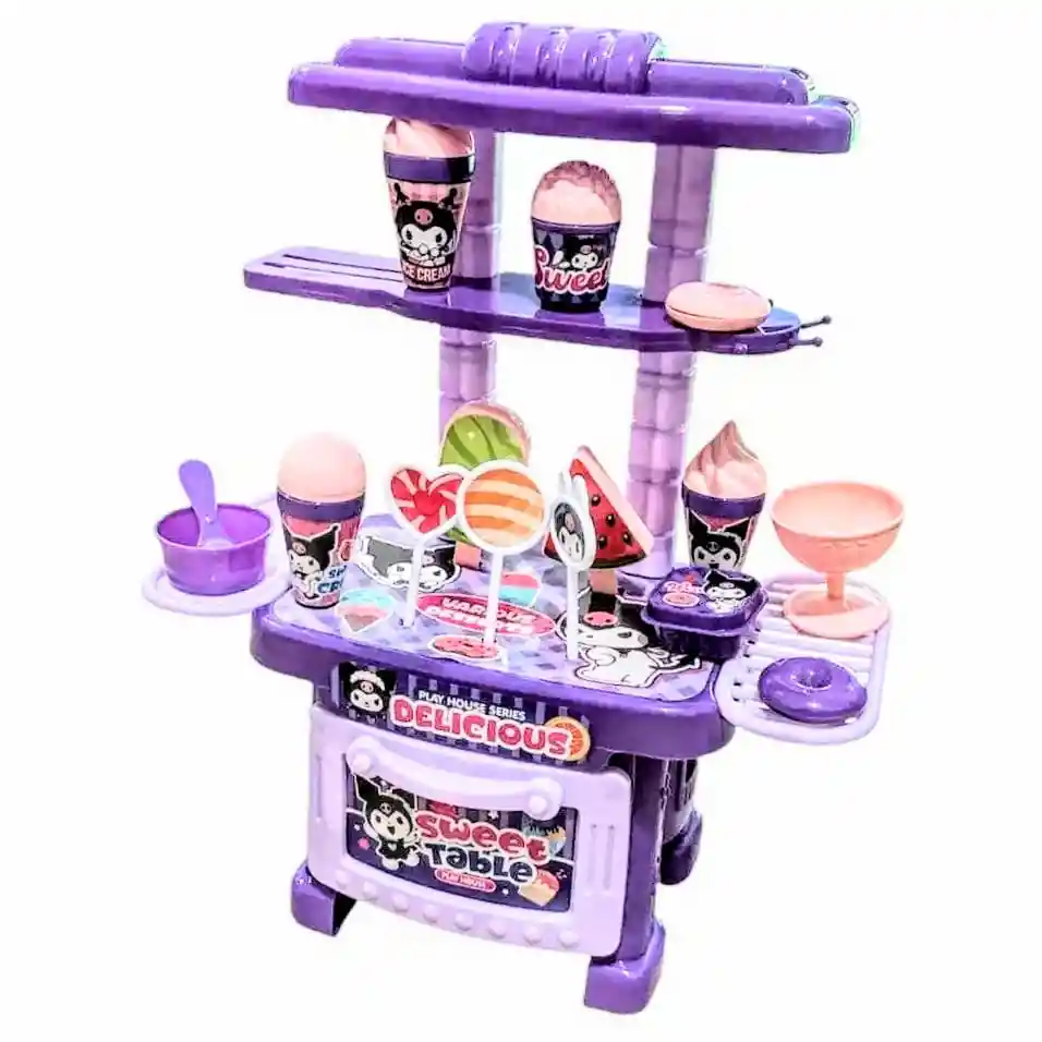 Cocina Cocinita Infantil Juego Niñas Kuromi tema del juego de helado, el juego de cocina tiene un total de 26 accesorios en varios modelos y formas de helado únicos y lindos. Tamaño del juguete Longitud 30 cm Altura 32cm Ancho 15cm