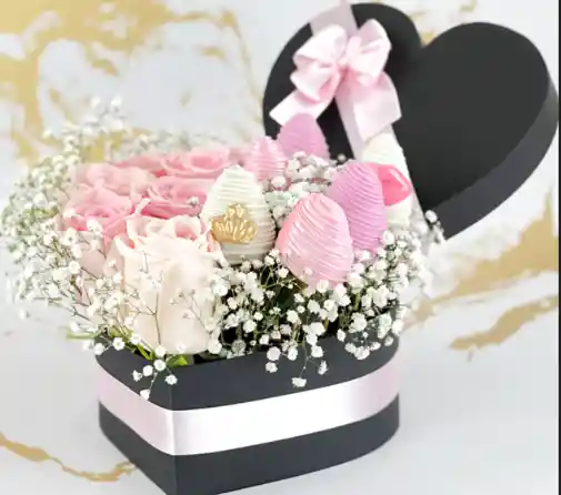 Un regalo que combina el romance y el placer: nuestro cofre de fresas con chocolate y rosas. Junto a las fresas, encontrarás un hermoso ramo de rosas, símbolo de amor y belleza. Es la combinación perfecta para expresar tus sentimientos y hacer que un día sea inolvidable Contenido: 1 cofre en forma de corazón elaborado en materiales de alta calidad. 1 Arreglo floral con Rosas y Fresas rosadas con chocolates y Gypsophilias. Decoración con Cintas y moño de tela. Presentación: Cofre Premium en forma de corazón con moño.