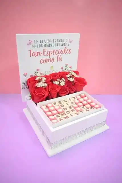 Cofre blanco de madera con mensaje en la tapa 10 rosas naturales (color a disponibilidad)chocomensaje feliz dia de amor y amistad se entrega envuelto en tull blanco