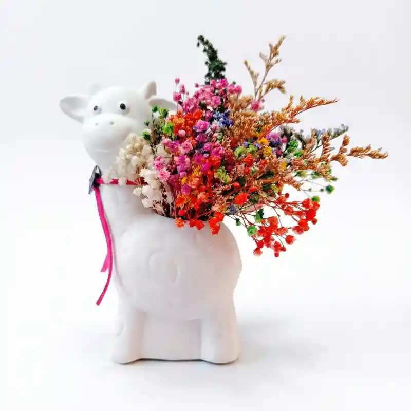 Este diseño floral artesanal es una celebración del amor expresado con ternura, color y creatividad. Elaborado con flores preservadas de larga duración, está pensado para sorprender con un gesto diferente, alegre y lleno de significado, perfecto para quienes disfrutan de los detalles que despiertan sonrisas. La composición floral destaca por su paleta vibrante y equilibrada, donde cada color aporta vida y dinamismo al arreglo. Las flores, cuidadosamente preservadas y dispuestas a mano, se integran armoniosamente en una matera decorativa con forma de animal, una pieza encantadora que aporta personalidad y calidez a cualquier espacio. Tiempos de entrega: de 1 a 4 días según disponibilidad de flores