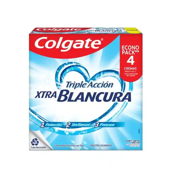 Contiene 4 Unidades 150 mL c/u. Con Fluor de La Crema Dental Colgate Triple Acción Xtra Blancura Esta Diseñada Para Brindar Una Limpieza Profunda y Protección Duradera Contra Las Caries Gracias a su Contenido de Fluor. Su Fórmula Avanzada no Solo Ayuda a Mantener Los Dientes Limpios y Libres de Placa Sino Que También Promueve Una Blancura Visible Con Cada Cepillado Dejando Una Sensación de Frescura y Limpieza Prolongada.