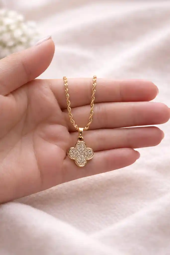 Collar con dije de trebol con brillantinas , cadena de 40 cm , color dorado , Material Cover gold